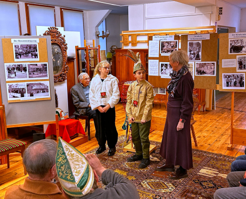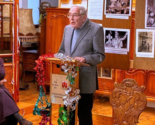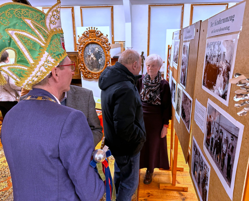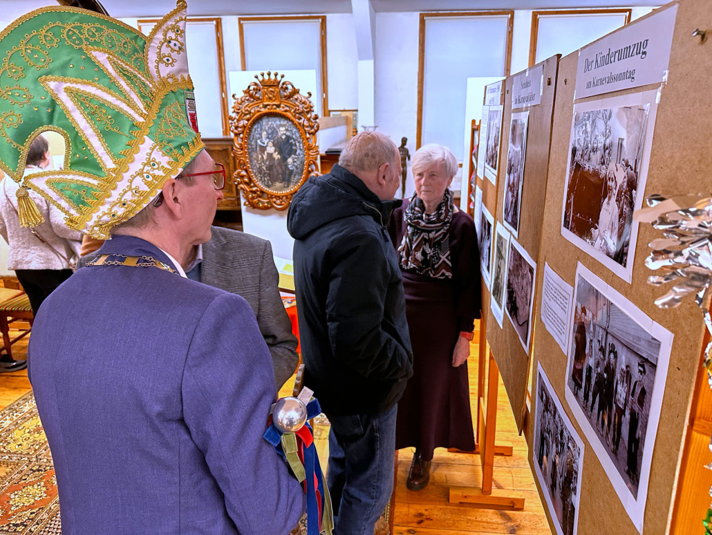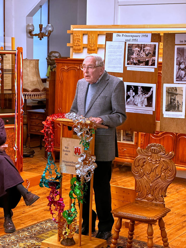 Die Eröffnungsrede hielt Johannes Waldhoff, der mit über 90 Jahren aus erster Hand von den damaligen Zeiten berichtete. Mit persönlichen Erinnerungen ließ er die Anfänge des Steinheimer Karnevals lebendig werden. Gleichzeitig beleuchtete er die schwierigen Jahre des Krieges und der Nachkriegszeit. Trotz aller Widrigkeiten verloren die Karnevalisten jener Zeit nicht den Mut und legten den Grundstein für das heutige karnevalistische Brauchtum in Steinheim. Waldhoff ist zudem Patenonkel des amtierenden Prinzen Andreas, der gemeinsam mit seinem Hofmarschall ebenfalls vor Ort war und sich die Ausstellung aufmerksam anschaute.