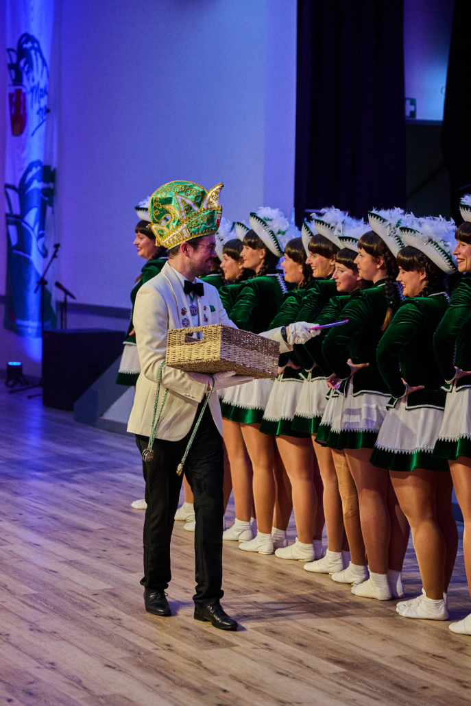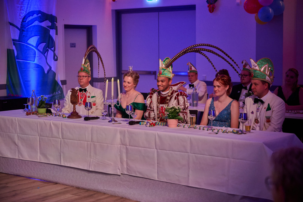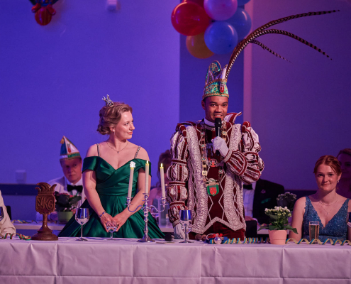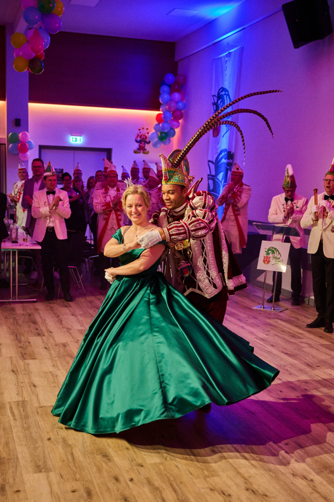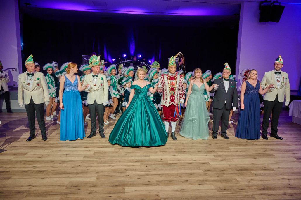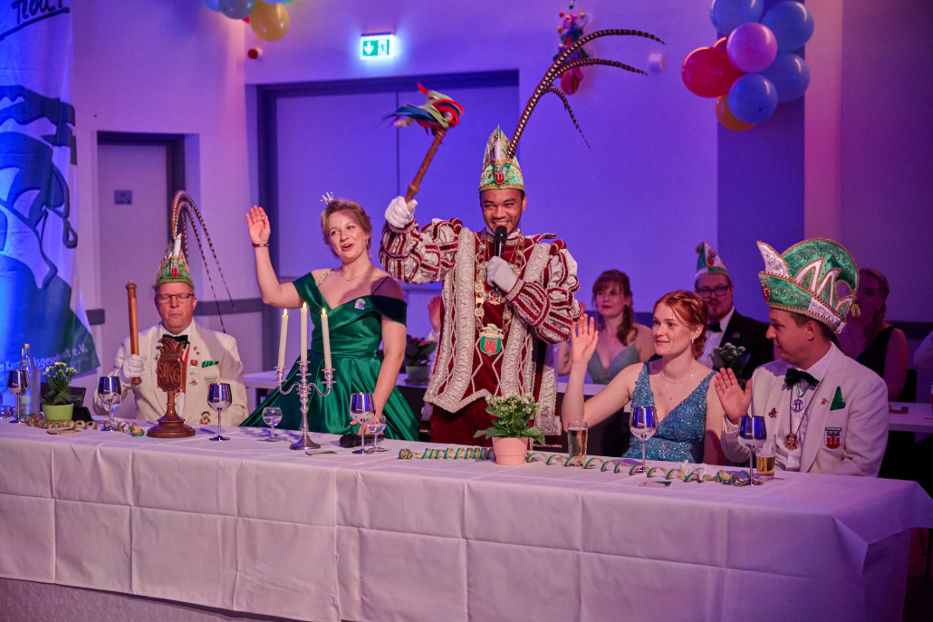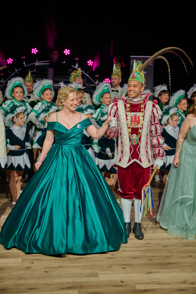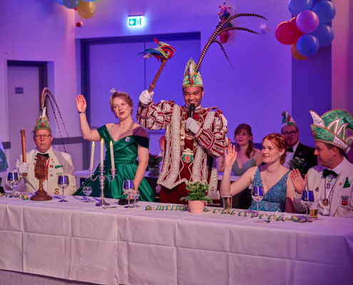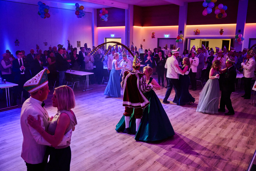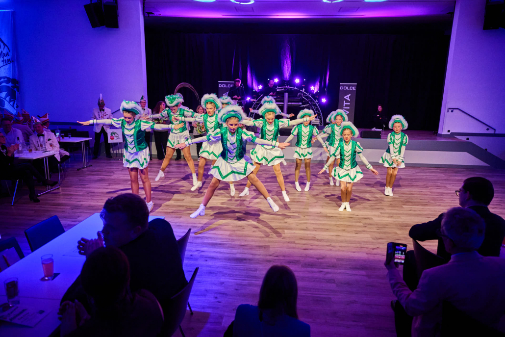 Der feierliche Einzug des Prinzenpaares Alexander und Uta bildete den würdigen Auftakt des Programms. In Begleitung der Prinzengarde, der Prinzensterne und der Sternschnuppen marschierten die Tollitäten in den Saal ein und wurden mit großem Beifall empfangen. Nach ihrem traditionellen dreifachen „Man teou!“ nahmen sie voller Stolz am Ehrentisch Platz. Gleich im Anschluss setzten die Prinzensterne mit ihrem schwungvollen Tanz ein erstes Ausrufezeichen und zeigten dem Prinzenpaar eine beeindruckende tänzerische Darbietung.