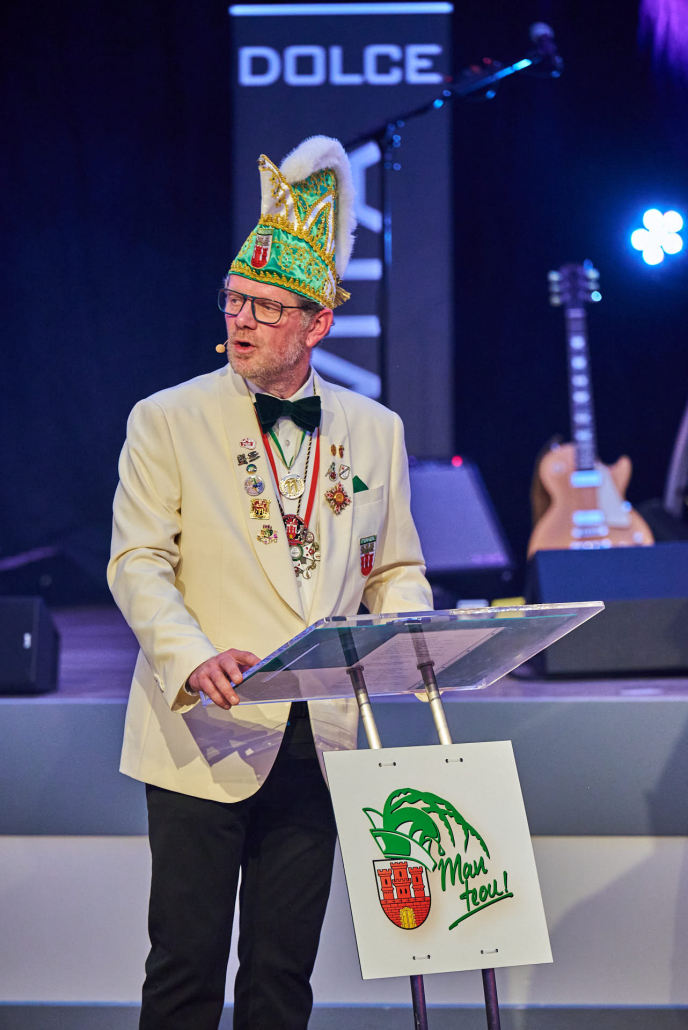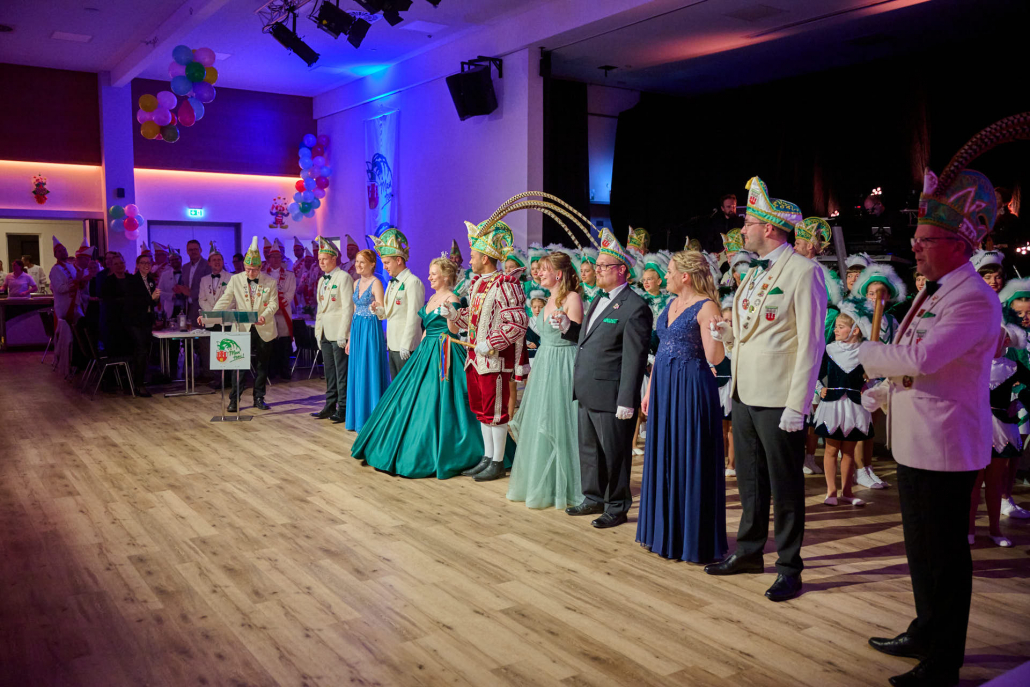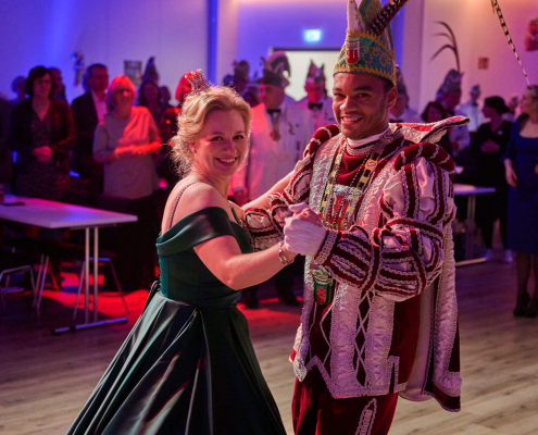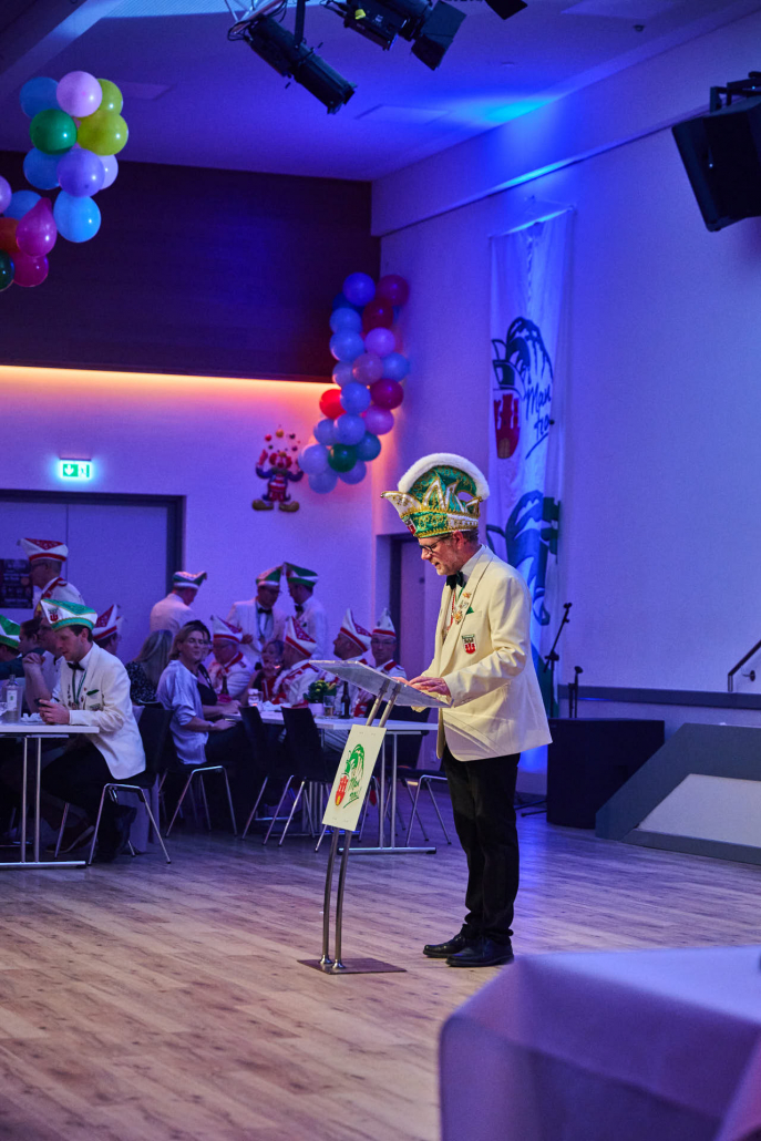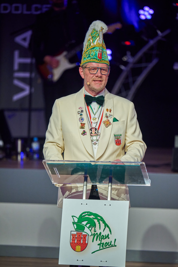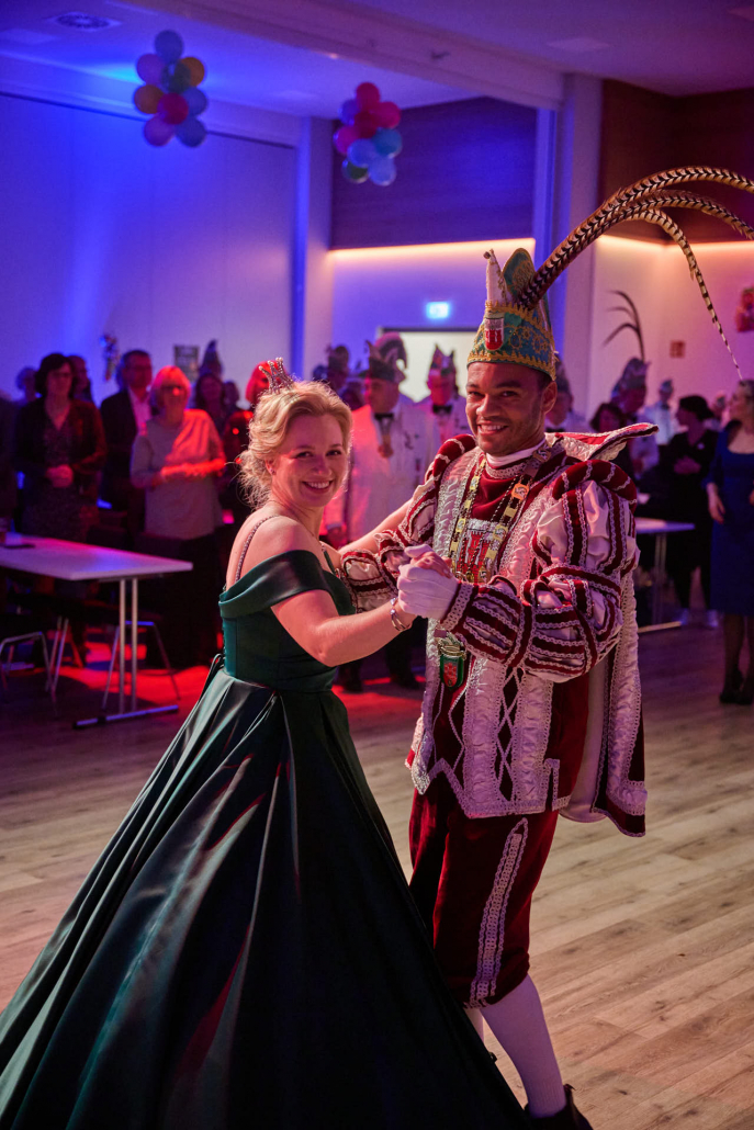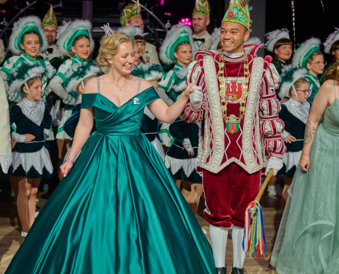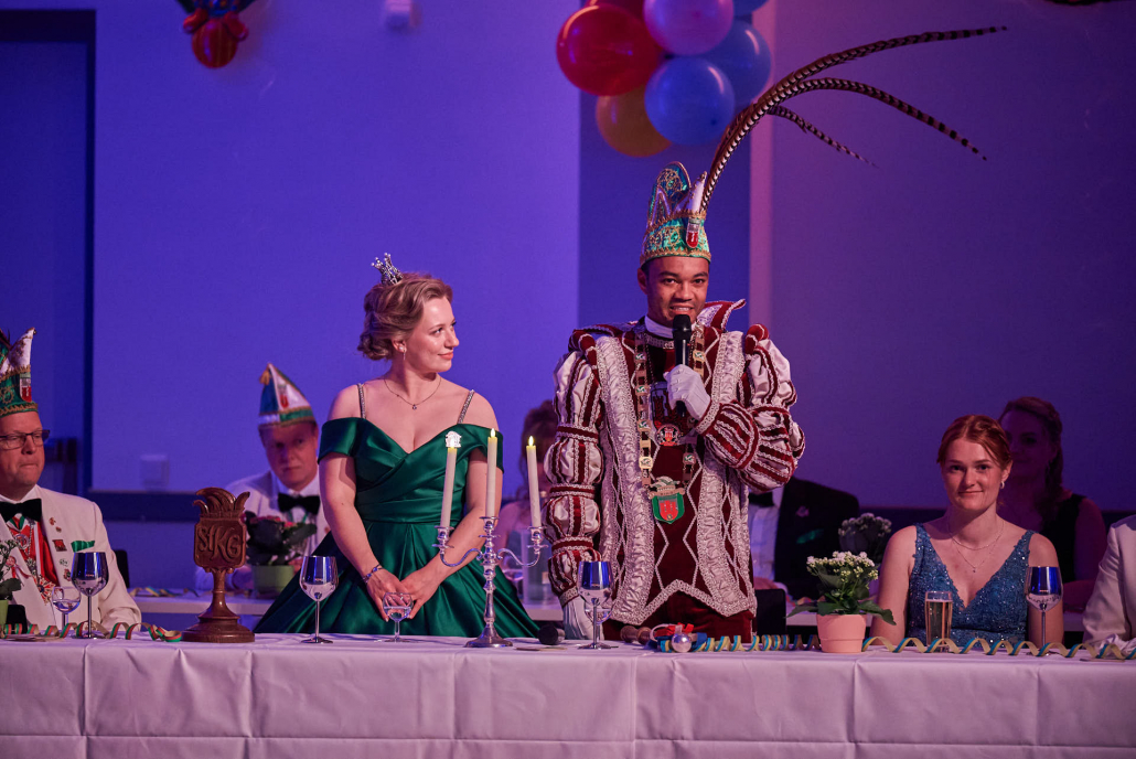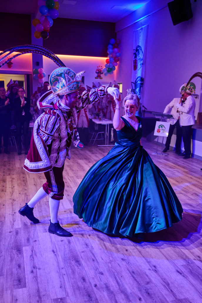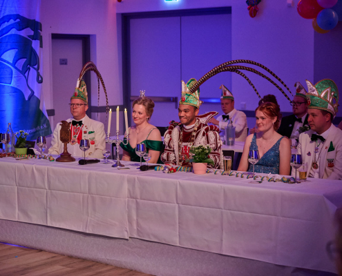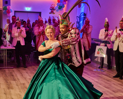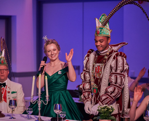 Der feierliche Einzug des Prinzenpaares Alexander und Uta bildete den würdigen Auftakt des Programms. In Begleitung der Prinzengarde, der Prinzensterne und der Sternschnuppen marschierten die Tollitäten in den Saal ein und wurden mit großem Beifall empfangen. Nach ihrem traditionellen dreifachen „Man teou!“ nahmen sie voller Stolz am Ehrentisch Platz. Gleich im Anschluss setzten die Prinzensterne mit ihrem schwungvollen Tanz ein erstes Ausrufezeichen und zeigten dem Prinzenpaar eine beeindruckende tänzerische Darbietung.