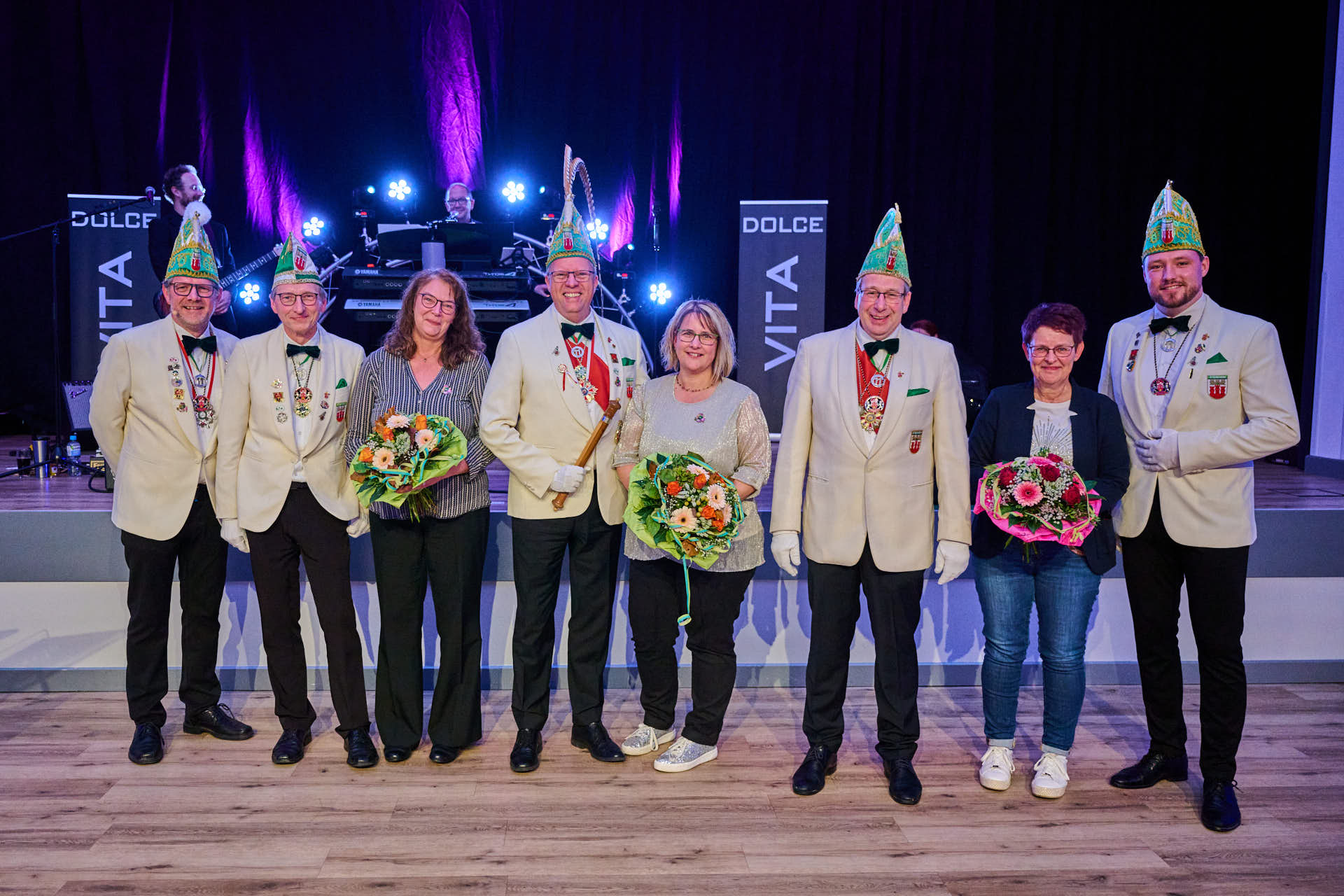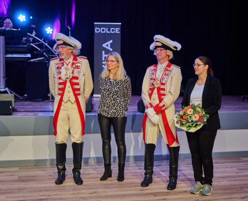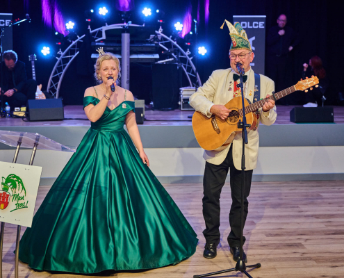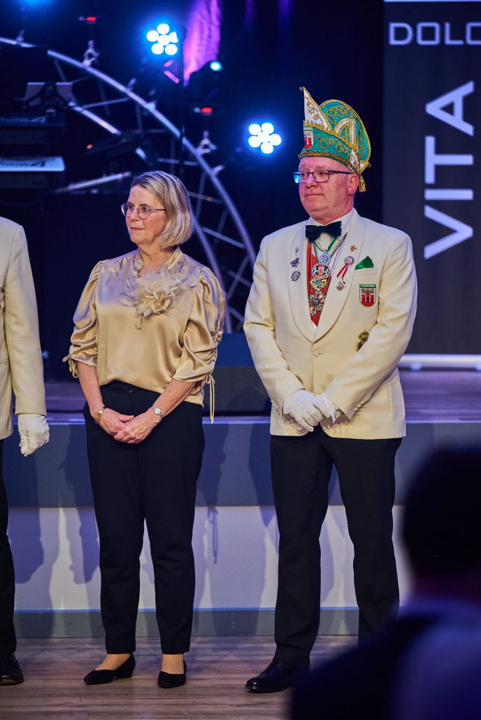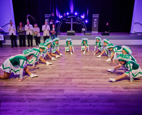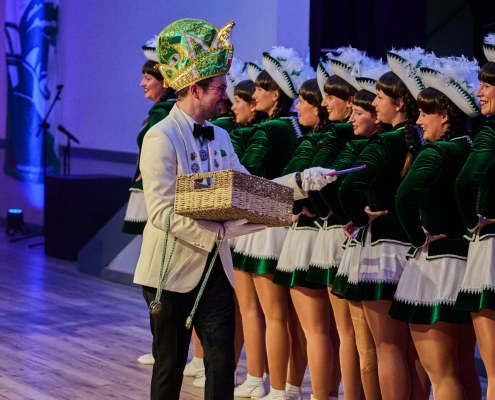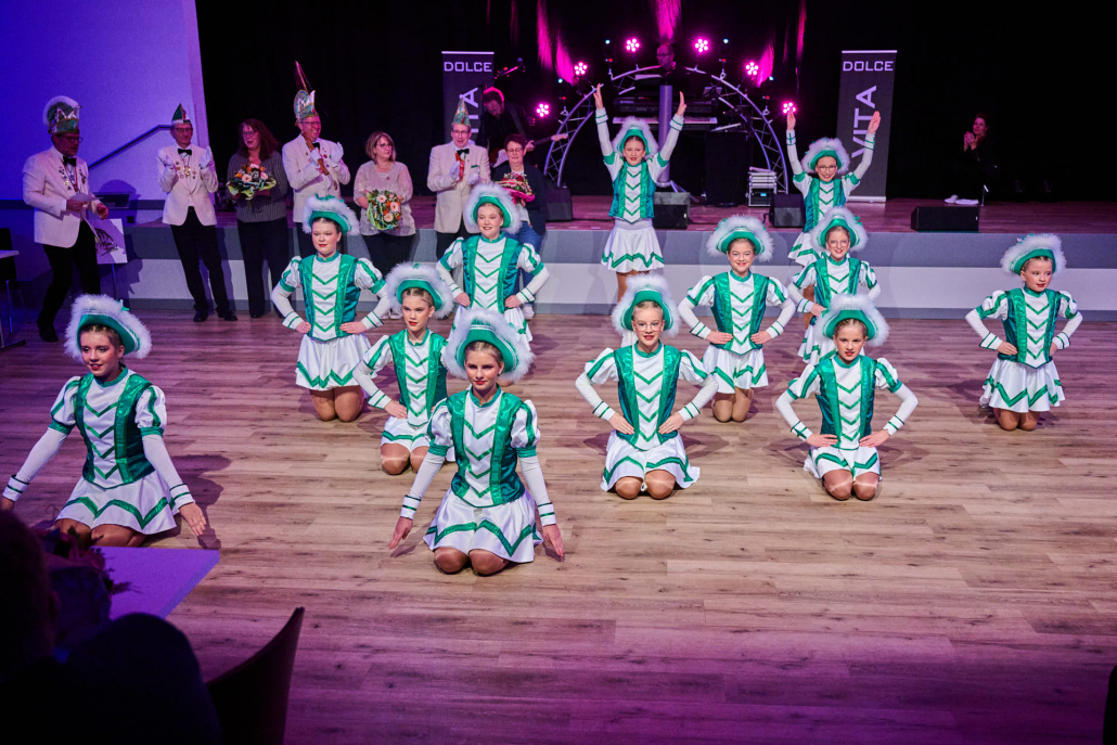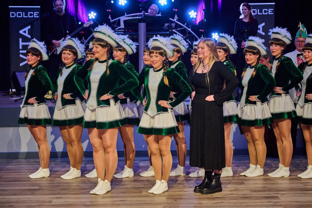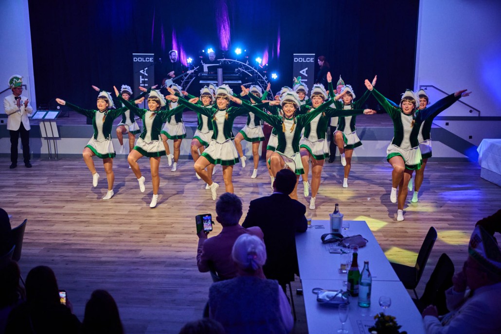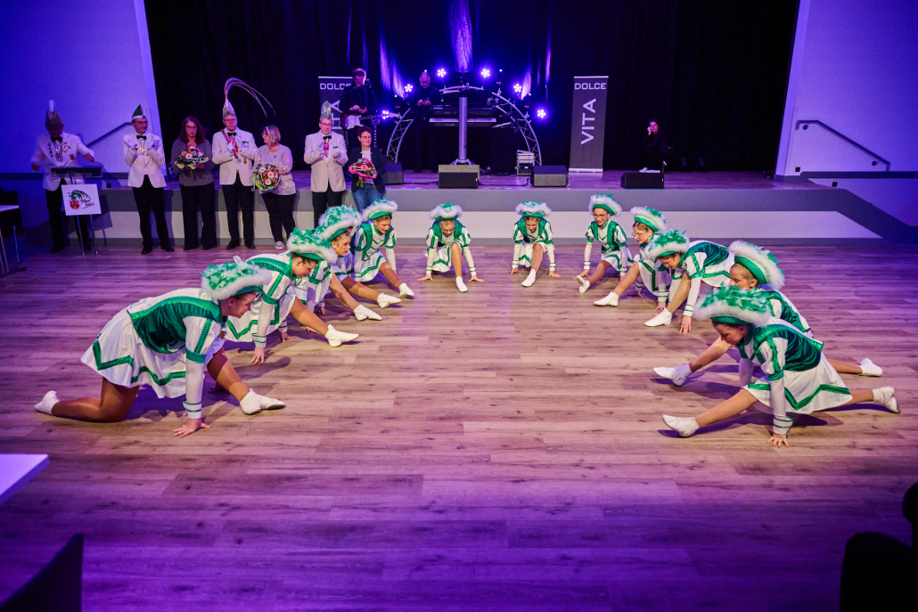 Im weiteren Verlauf erwartete das Publikum ein bunter Mix aus Musik und Tanz, der keine Sekunde Langeweile aufkommen ließ. Für den musikalische Auftritt sorgte das Duo KUUKU – Klaren Udo und Klaren Uta – das mit bekannten Liedern zunächst zum Mitwippen einlud. „Rund um den Kump herum“ brachte die Gäste zum Schunkeln, während das neue Lied „Mein Herz schlägt Man teou“ sich bereits jetzt zu einem wahren Ohrwurm entwickelte. Aber auch die Prinzengarde und Solomariechen zeigten sich in bester Form: Die energiegeladenen Auftritte der Prinzengarde, der Prinzensterne und der Sternschnuppen ließen die Bühne beben. Die Solomariechen Frieda Nolting und Merle Pollmann beeindruckten zudem mit präziser Technik, Dynamik und strahlender Bühnenpräsenz.