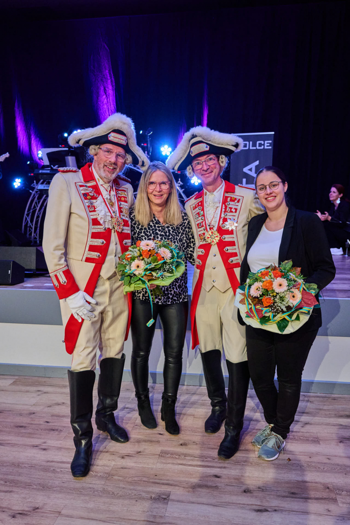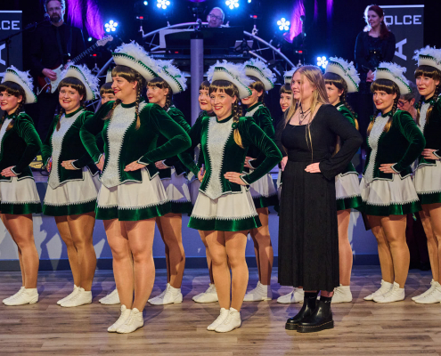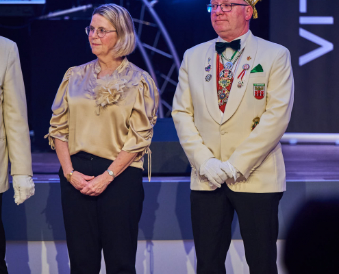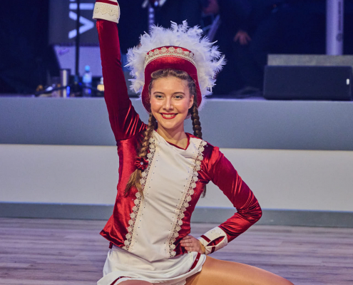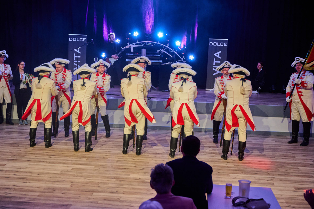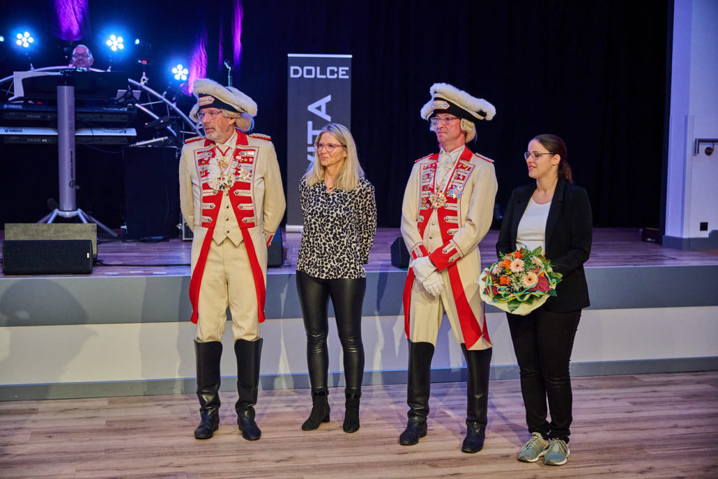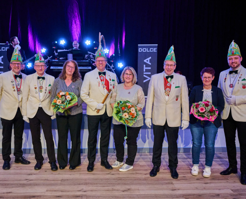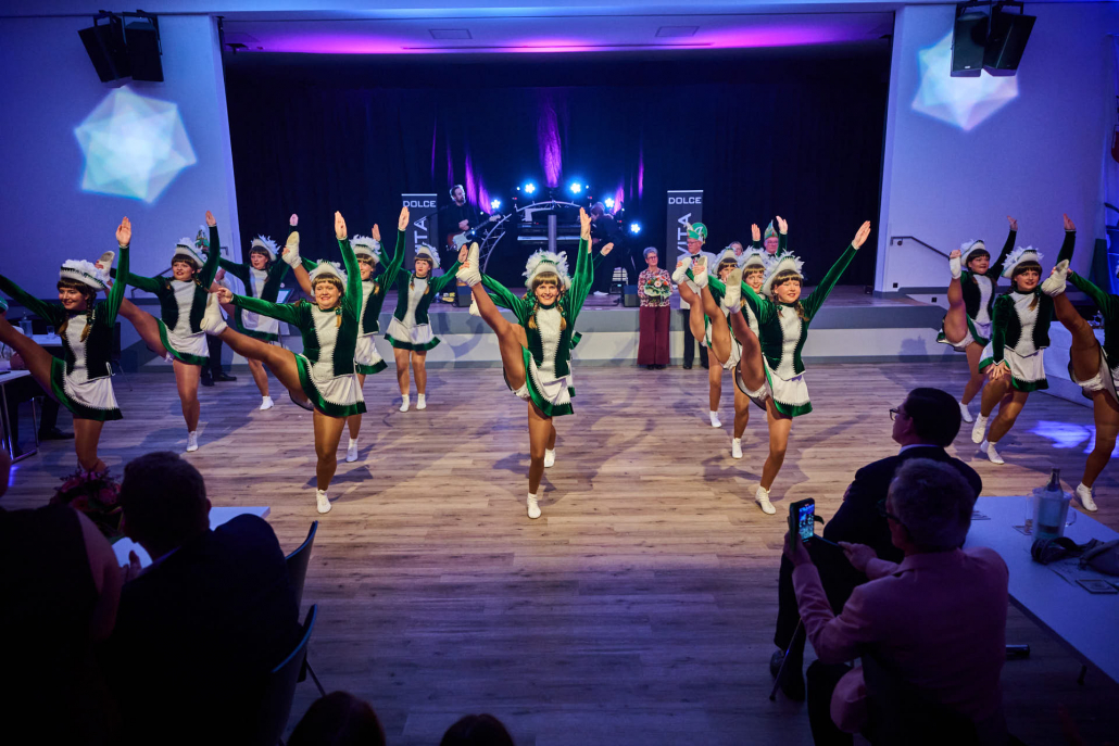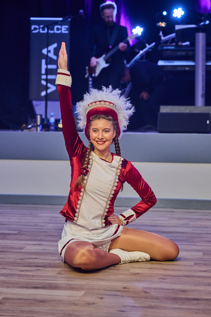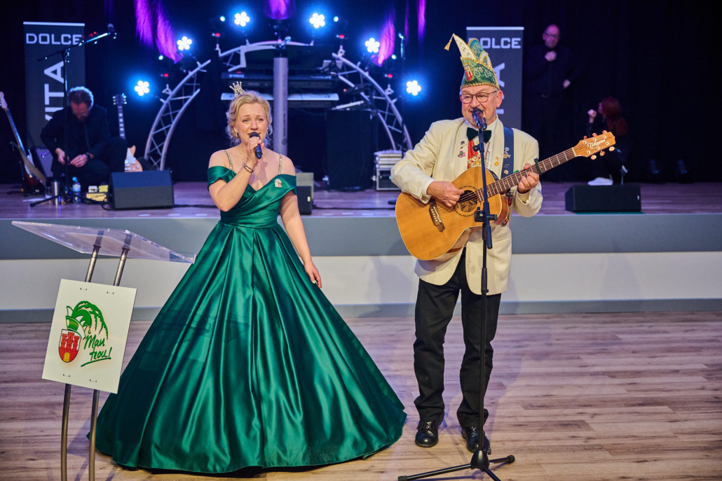 Im weiteren Verlauf erwartete das Publikum ein bunter Mix aus Musik und Tanz, der keine Sekunde Langeweile aufkommen ließ. Für den musikalische Auftritt sorgte das Duo KUUKU – Klaren Udo und Klaren Uta – das mit bekannten Liedern zunächst zum Mitwippen einlud. „Rund um den Kump herum“ brachte die Gäste zum Schunkeln, während das neue Lied „Mein Herz schlägt Man teou“ sich bereits jetzt zu einem wahren Ohrwurm entwickelte. Aber auch die Prinzengarde und Solomariechen zeigten sich in bester Form: Die energiegeladenen Auftritte der Prinzengarde, der Prinzensterne und der Sternschnuppen ließen die Bühne beben. Die Solomariechen Frieda Nolting und Merle Pollmann beeindruckten zudem mit präziser Technik, Dynamik und strahlender Bühnenpräsenz.