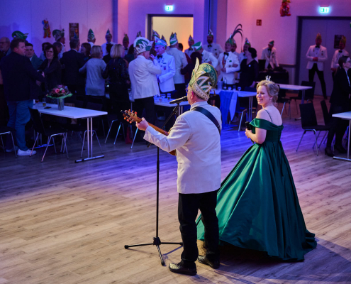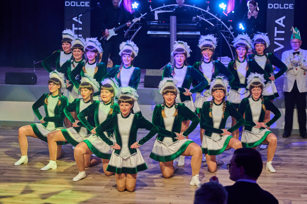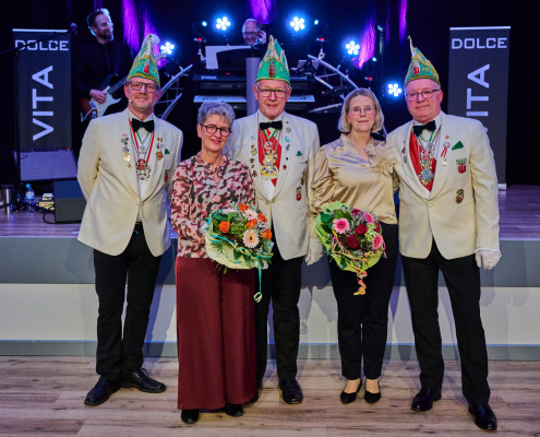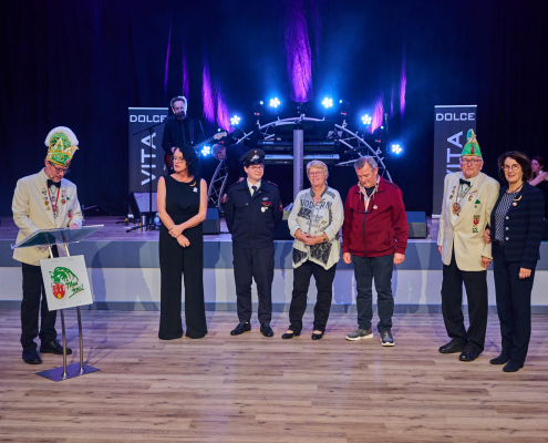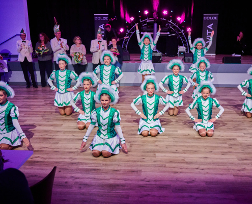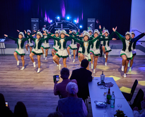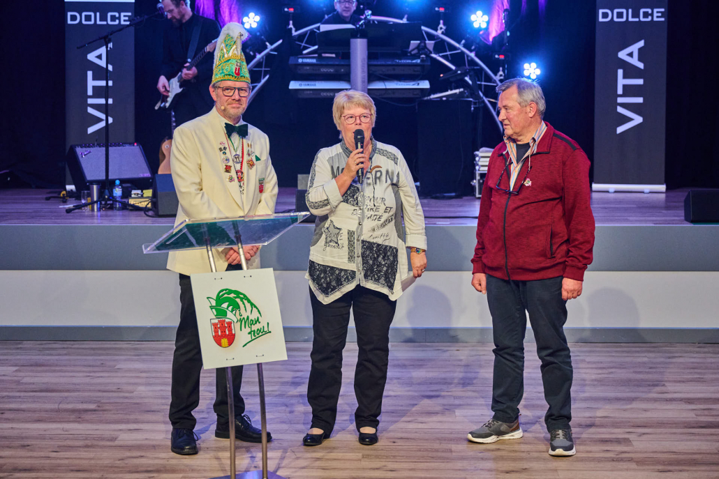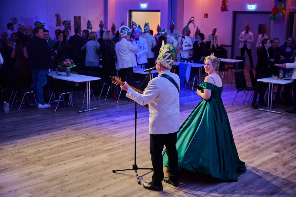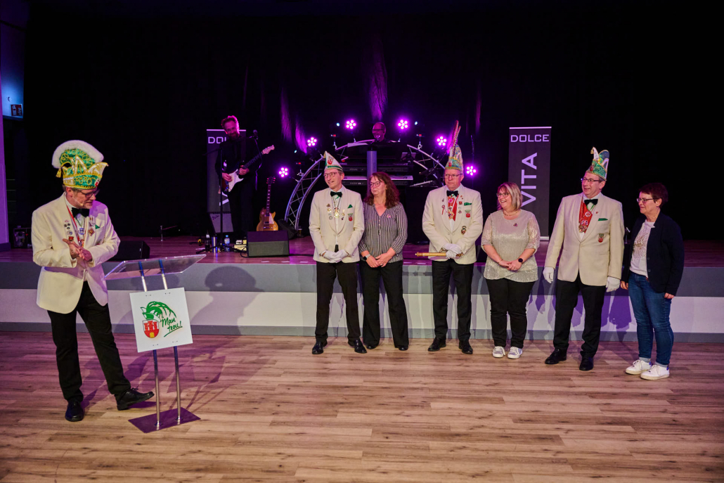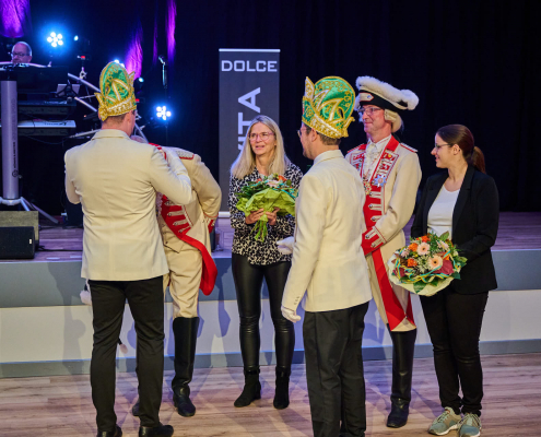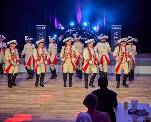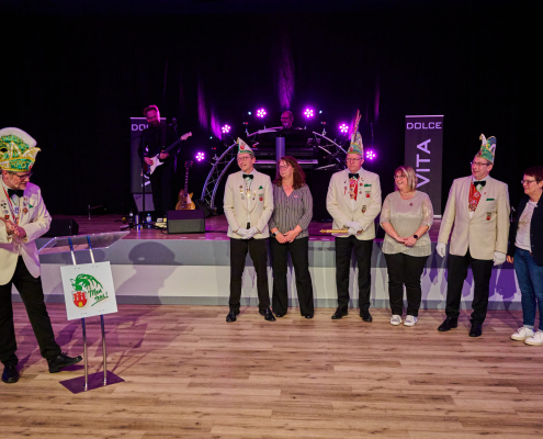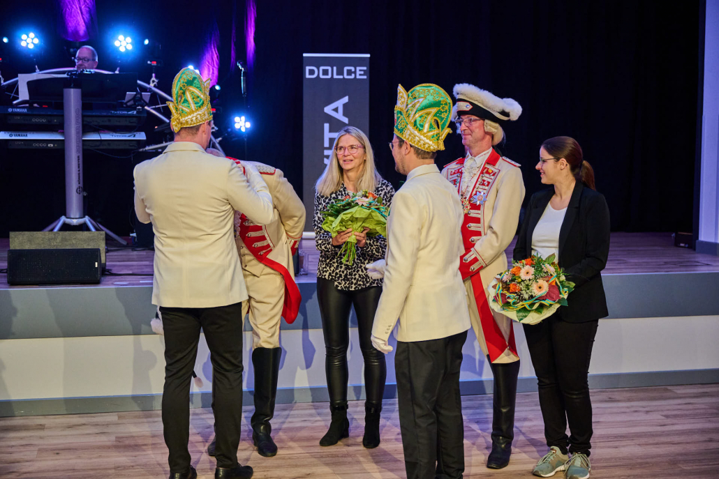 Im weiteren Verlauf erwartete das Publikum ein bunter Mix aus Musik und Tanz, der keine Sekunde Langeweile aufkommen ließ. Für den musikalische Auftritt sorgte das Duo KUUKU – Klaren Udo und Klaren Uta – das mit bekannten Liedern zunächst zum Mitwippen einlud. „Rund um den Kump herum“ brachte die Gäste zum Schunkeln, während das neue Lied „Mein Herz schlägt Man teou“ sich bereits jetzt zu einem wahren Ohrwurm entwickelte. Aber auch die Prinzengarde und Solomariechen zeigten sich in bester Form: Die energiegeladenen Auftritte der Prinzengarde, der Prinzensterne und der Sternschnuppen ließen die Bühne beben. Die Solomariechen Frieda Nolting und Merle Pollmann beeindruckten zudem mit präziser Technik, Dynamik und strahlender Bühnenpräsenz.