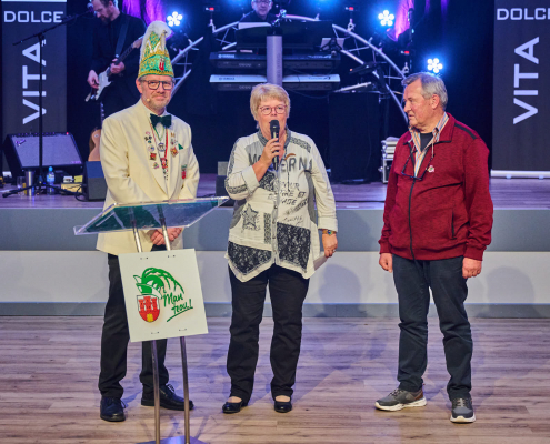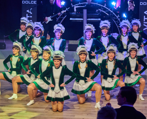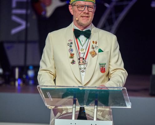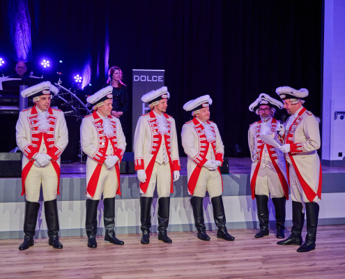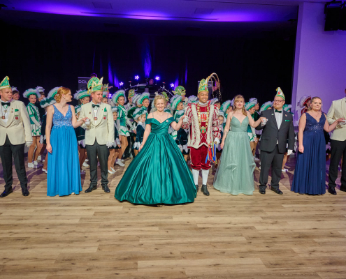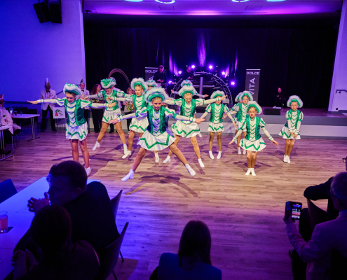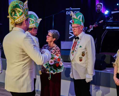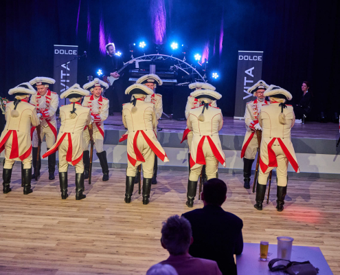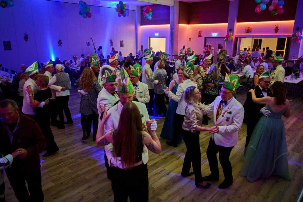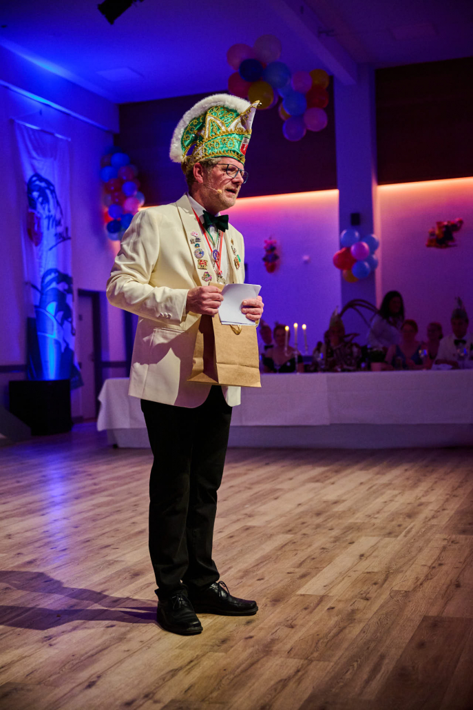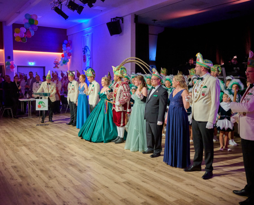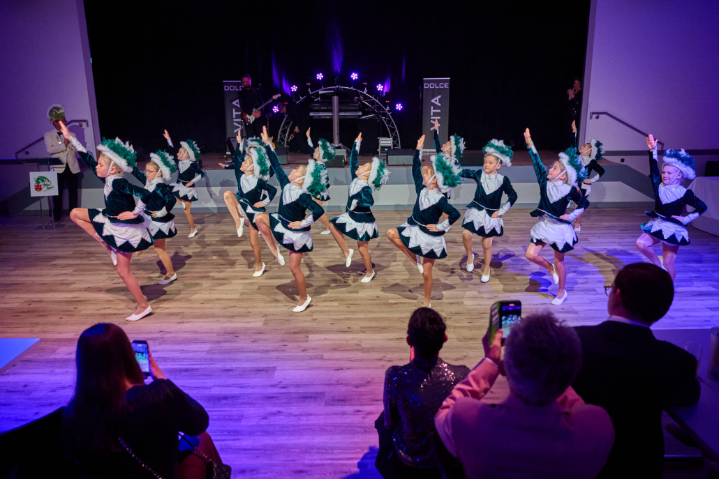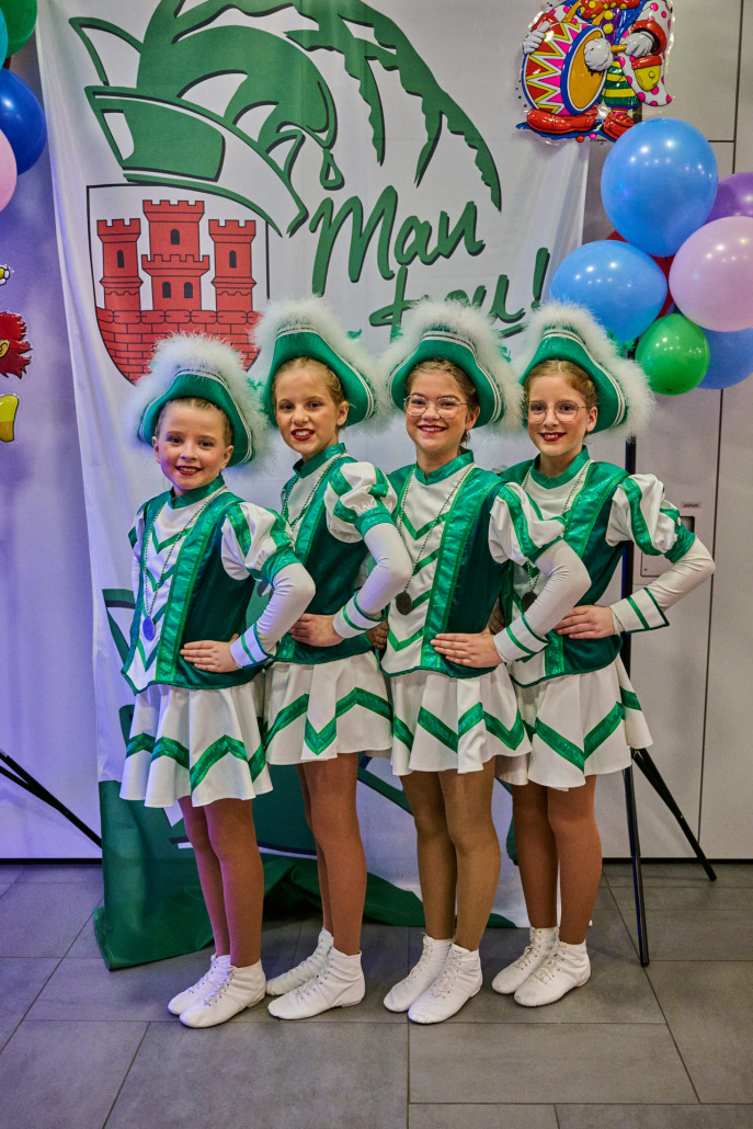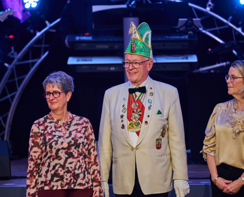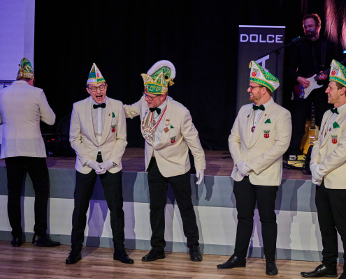 Im weiteren Verlauf erwartete das Publikum ein bunter Mix aus Musik und Tanz, der keine Sekunde Langeweile aufkommen ließ. Für den musikalische Auftritt sorgte das Duo KUUKU – Klaren Udo und Klaren Uta – das mit bekannten Liedern zunächst zum Mitwippen einlud. „Rund um den Kump herum“ brachte die Gäste zum Schunkeln, während das neue Lied „Mein Herz schlägt Man teou“ sich bereits jetzt zu einem wahren Ohrwurm entwickelte. Aber auch die Prinzengarde und Solomariechen zeigten sich in bester Form: Die energiegeladenen Auftritte der Prinzengarde, der Prinzensterne und der Sternschnuppen ließen die Bühne beben. Die Solomariechen Frieda Nolting und Merle Pollmann beeindruckten zudem mit präziser Technik, Dynamik und strahlender Bühnenpräsenz.