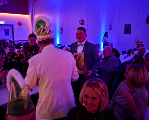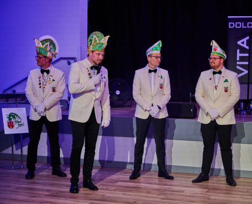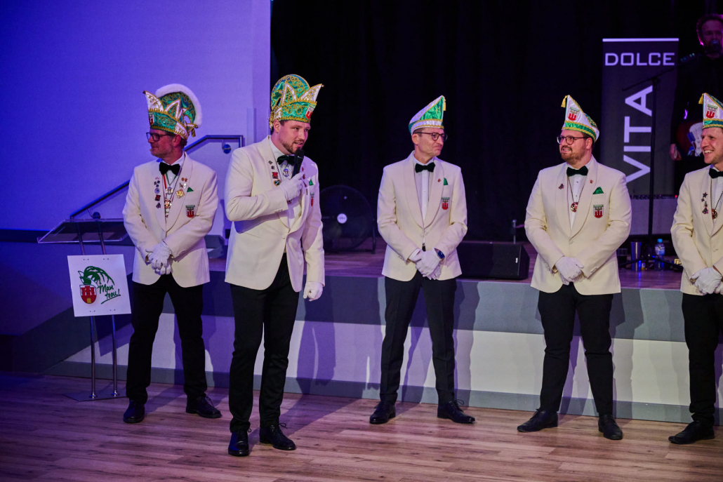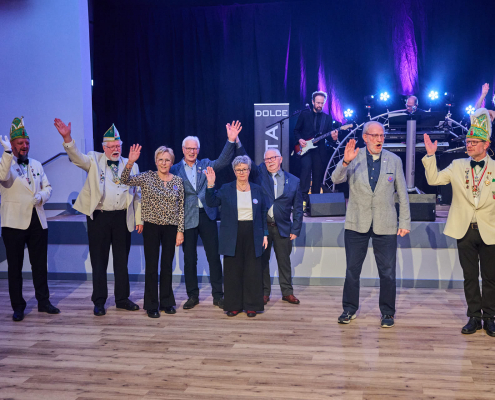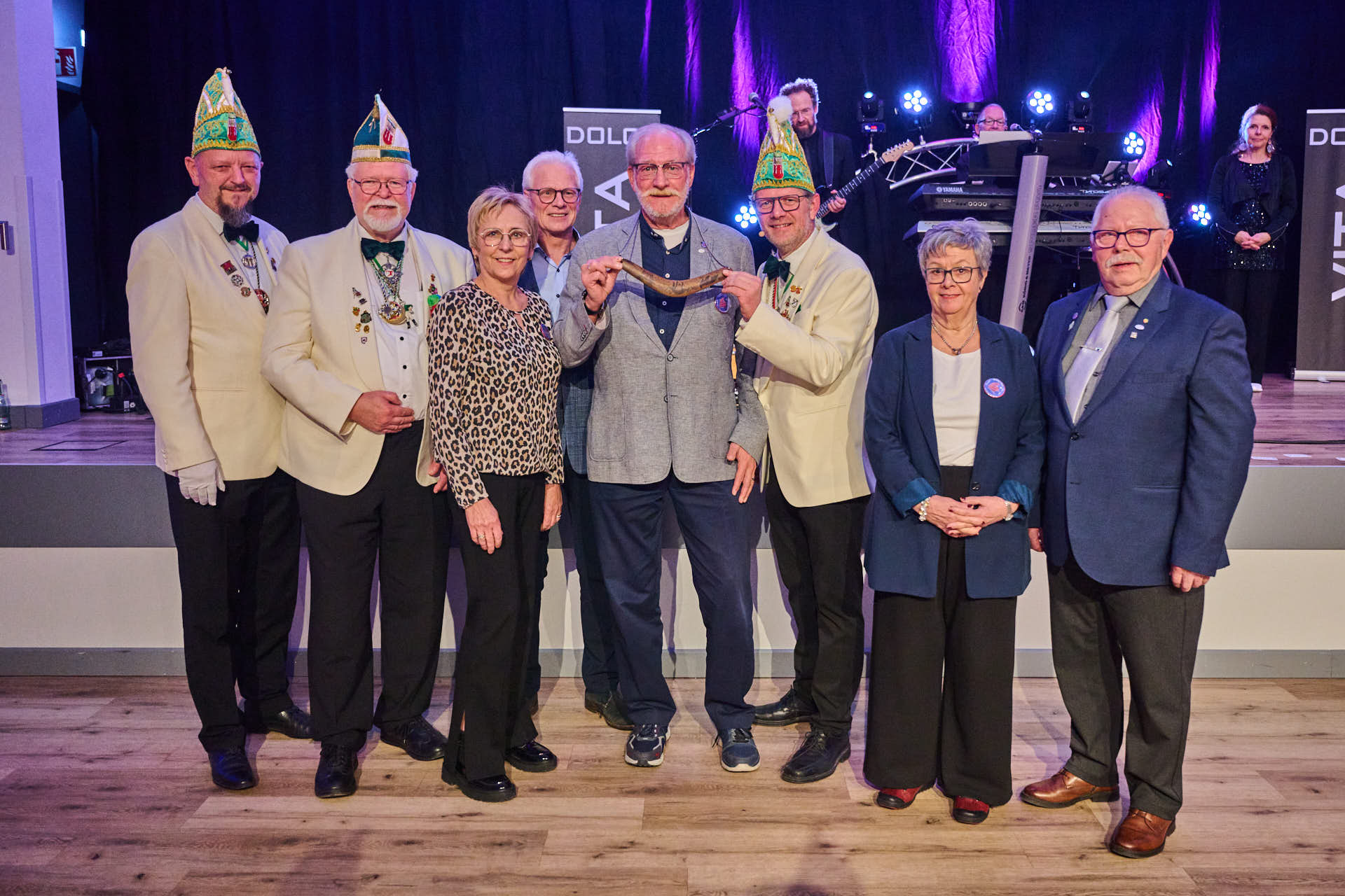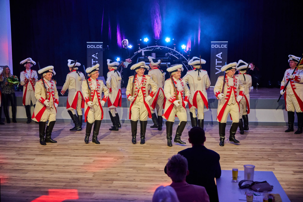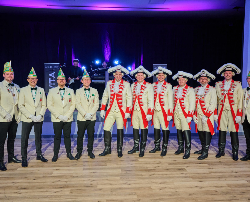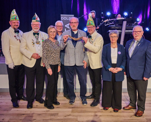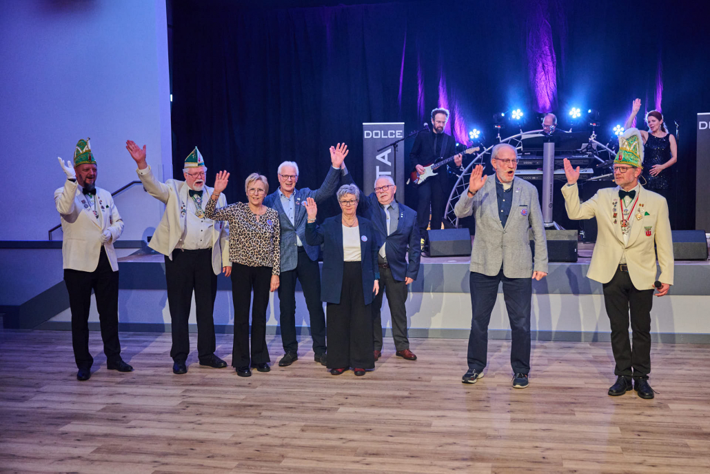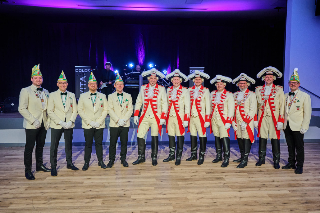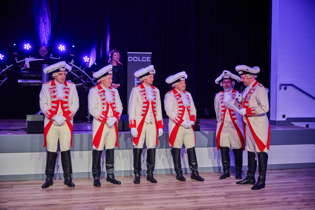 Auch hinter den Kulissen gab es wichtige personelle Ergänzungen. Der Elferrat begrüßte gleich drei neue Mitglieder – Hubertus Lammersen, Daniel Korte und Bartholomäus Wozcnika – in seinen Reihen. Die Garde stellte zudem René Wesdijk, Marcel Nunne, Daniel Nunne und Eddi Serr als neue Gardisten vor, die stolz in ihren rot-weißen Uniformen mit glänzenden Stiefeln in der Halle einmarschierten. Acht neue Kräfte insgesamt, die künftig ihre Zeit, Begeisterung und Tatkraft für den Steinheimer Karneval einbringen möchten. Gleichzeitig wurden langjährige Weggefährten gebührend geehrt: Für beeindruckende 22 Jahre Mitgliedschaft im Elferrat erhielten Karsten Husemann, Allo Lammersen und Andreas Waldhoff Auszeichnungen. Zudem wurden Klaus Ovenhausen und Matthias Wallbaum für ihr fortwährendes Engagement in den Stand eines Senators erhoben.