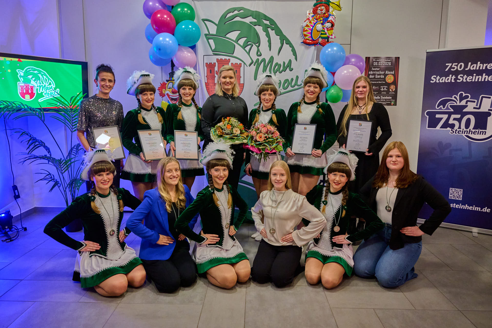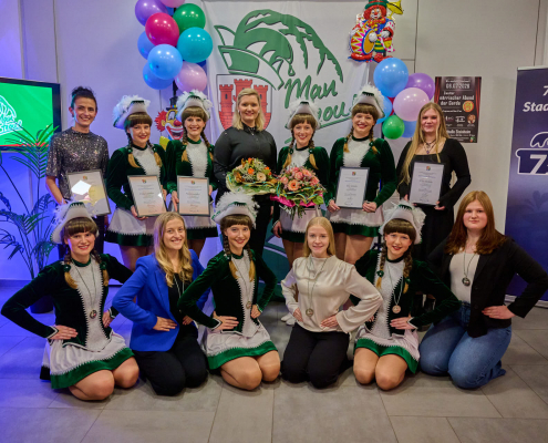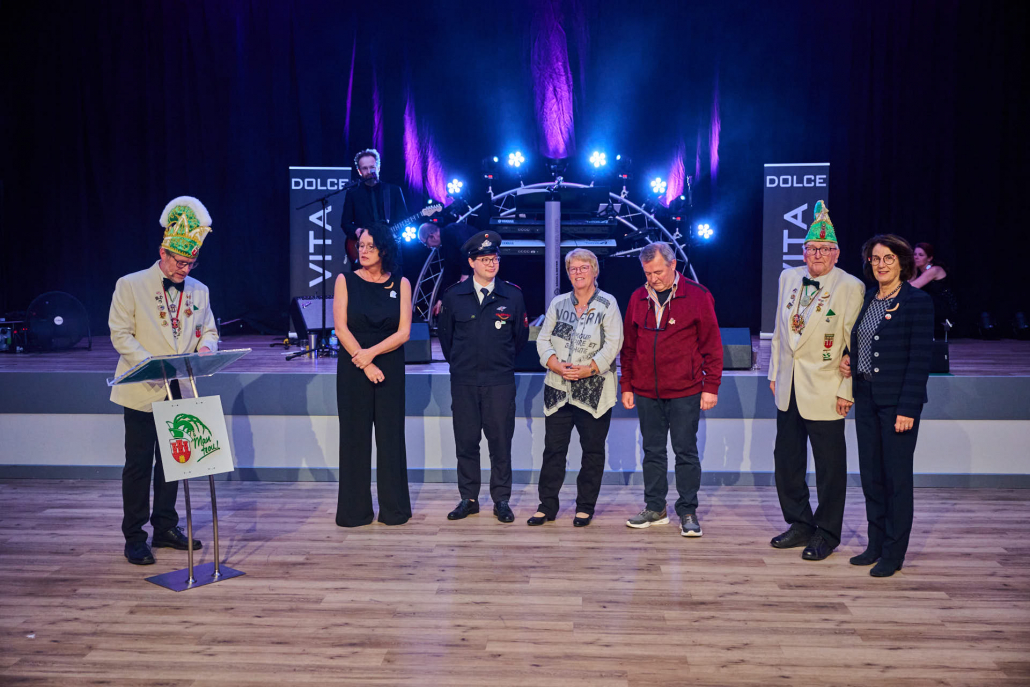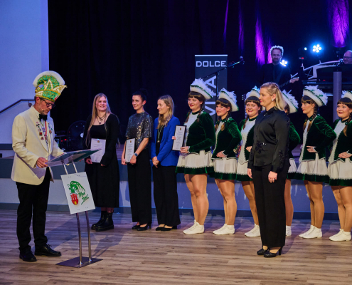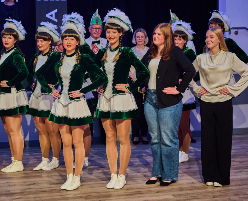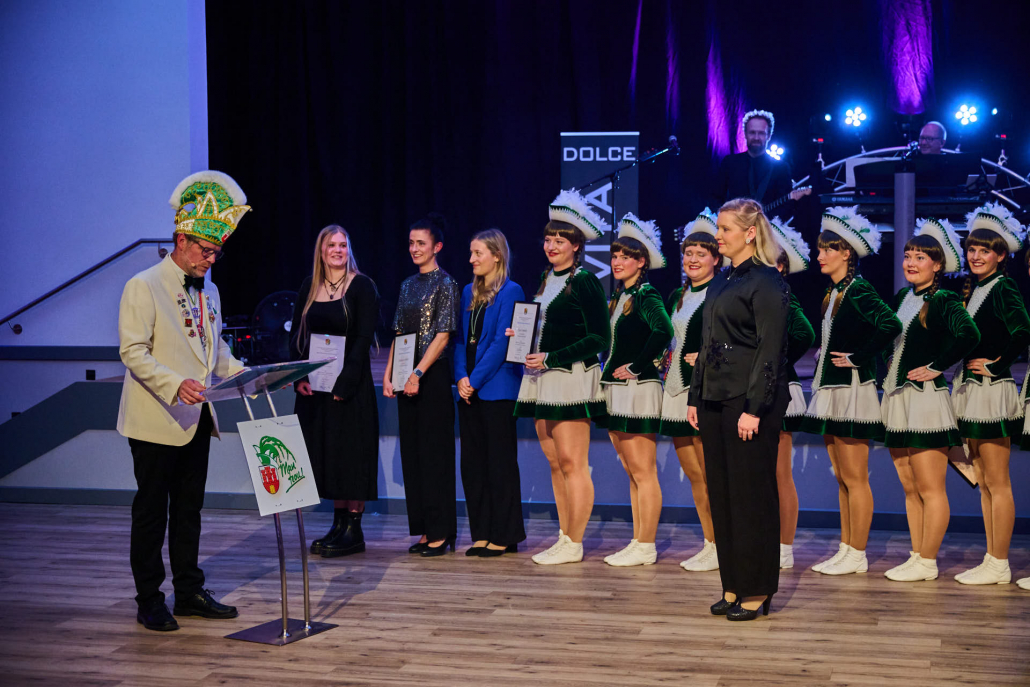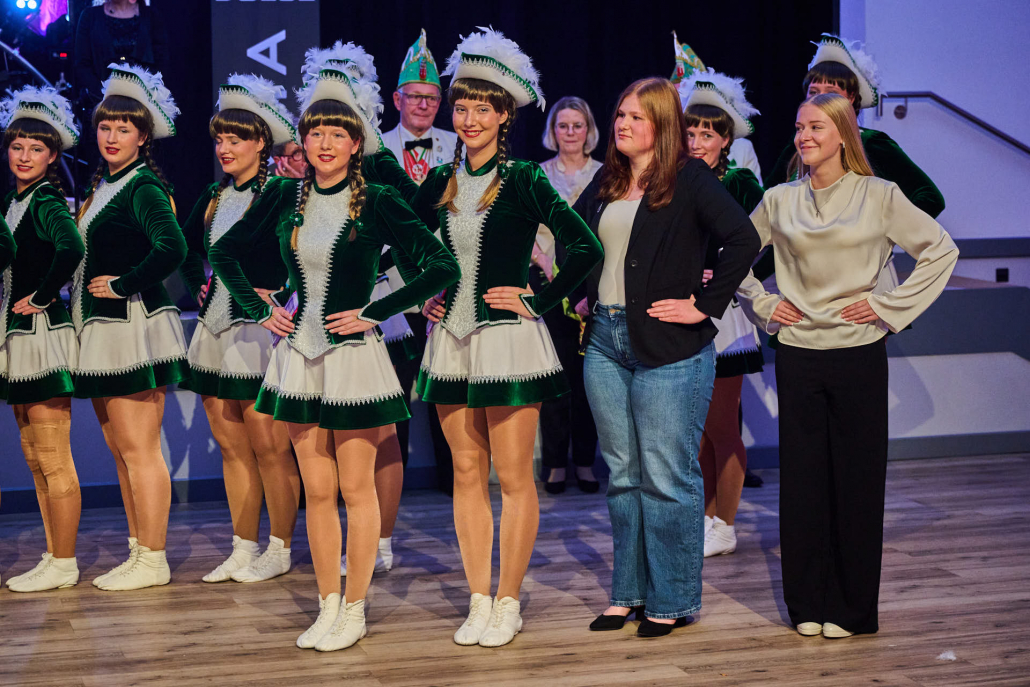 Traditionell gehört zum Elften im Elften auch die Würdigung verdienter aktiver Mitglieder. In diesem Jahr durften sich zahlreiche Tänzerinnen über wohlverdiente Orden freuen. Neue Einsteigerorden gingen an Emilia Brockhagen, Lilly Chmielewski, Annalena Henke und Mia Oebbeke von den Prinzensternen sowie an Leonie Bargsten, Zoé-Sophie Fiene, Amelie Waldhoff und Merle Pollmann aus der Prinzengarde. Mit dem 3-Jahres-Orden wurden Maike Lunkewitz und Marlen Strato ausgezeichnet. Das BDK-Abzeichen in Bronze erhielten Pia Krawinkel und Finja Leßmann; in Silber wurden Nina Mertens, Eva Schmitz, Paula Walbaum und Daniela Nübel geehrt. Eine besonders herzliche Würdigung galt Anna Klaes, die für beeindruckende 18 Jahre Tanzleidenschaft augenzwinkernd ihren närrischen „Führerschein“ überreicht bekam.