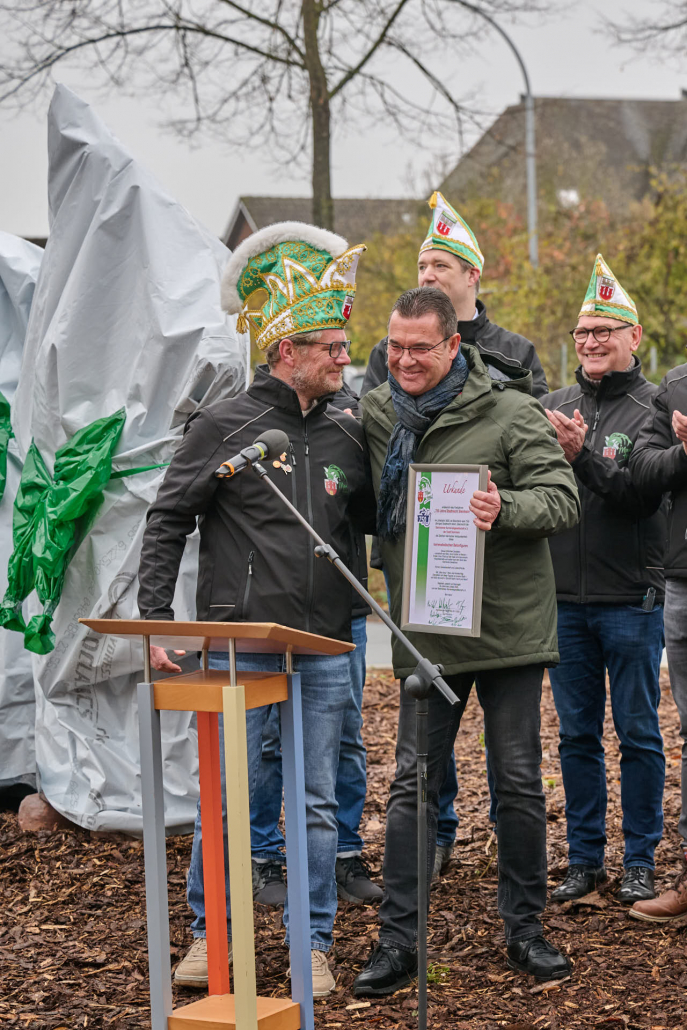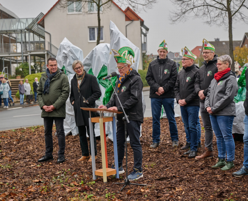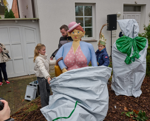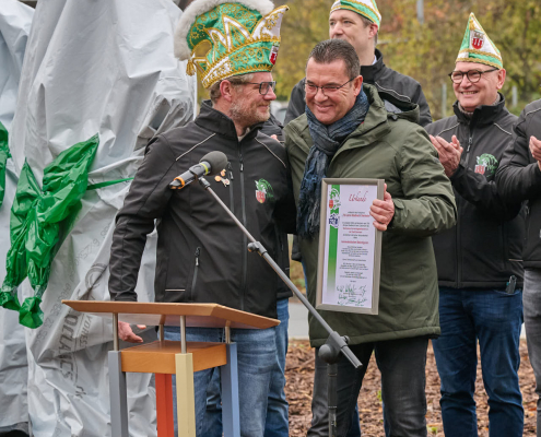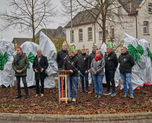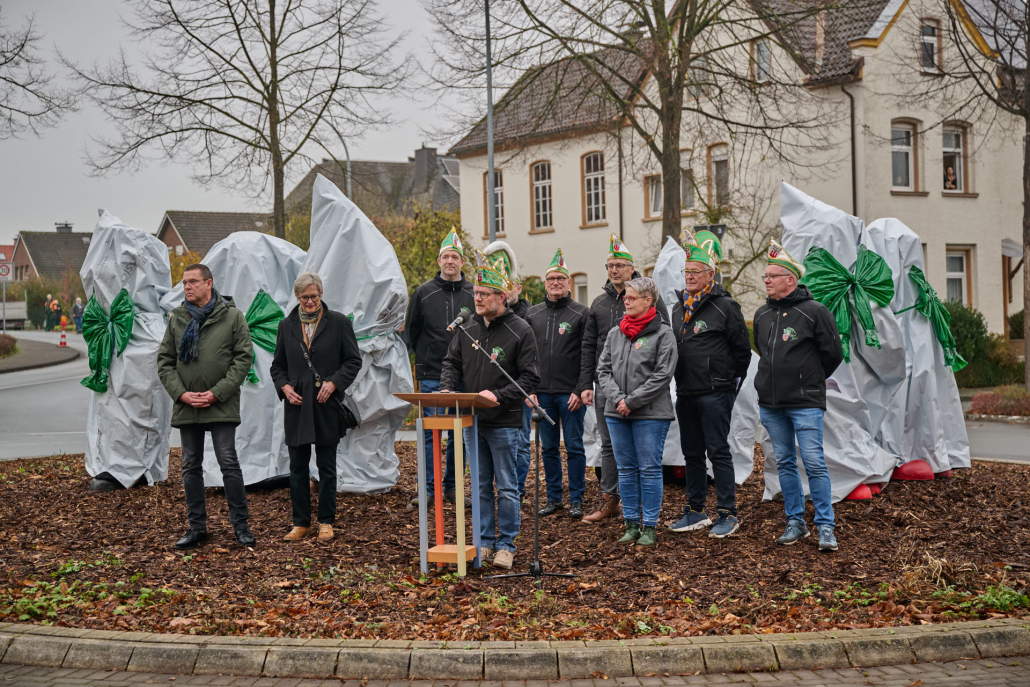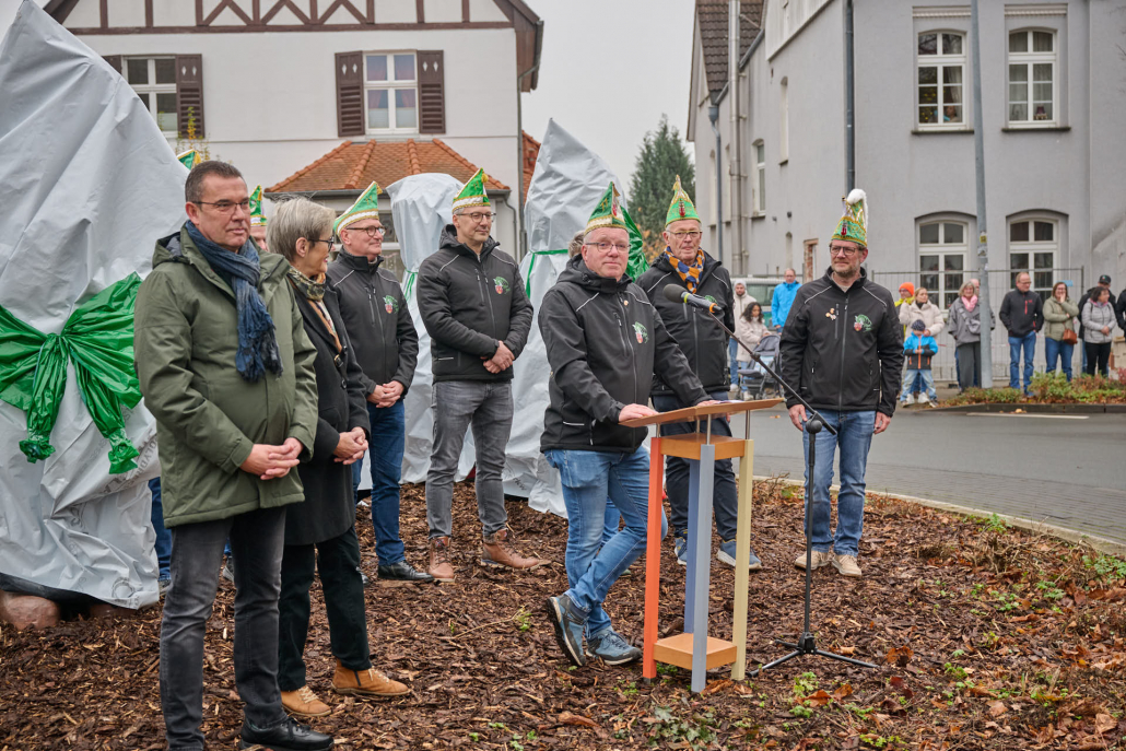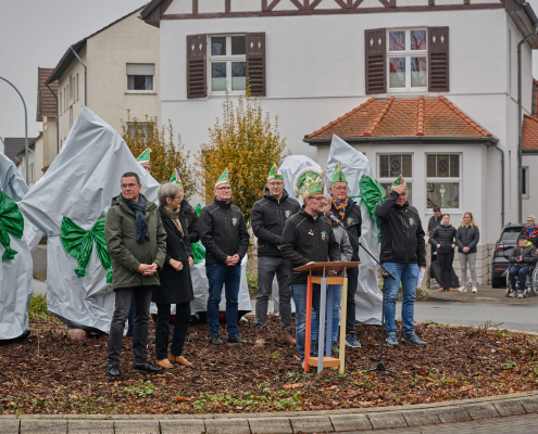Ab 11:11 Uhr am 8. November 2025 fiel der Schleier: Unter großem Jubel zahlreicher Närrinnen und Narren wurden am Steinheimer Kreisel die neuen karnevalistischen Betonfiguren feierlich enthüllt. Mit dabei waren neben dem Präsidenten der Steinheimer Karnevalsgesellschaft, Axel Remmert-Bobe, auch Bürgermeister Carsten Torke, stellvertretende Landrätin Magdalena Volmert, das engagierte Bauteam hinter den Figuren, das Prinzenpaar, das Kinderprinzenpaar sowie viele begeisterte Zuschauerinnen und Zuschauer.