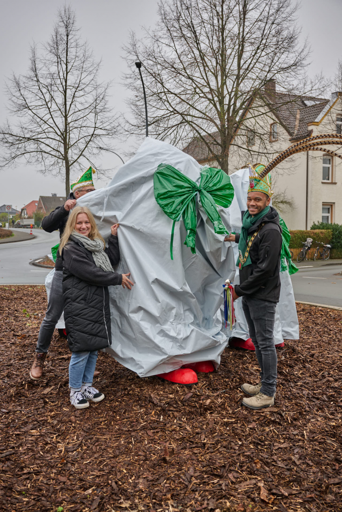 Das Bauteam, bestehend aus Wilma und Thomas Thorenmeier, Sascha Nolting, Michael Lotsch, Thorsten Böke, Frank Jansen, Klaus Ovenhausen und Matthias Wallbaum, wagte sich dabei auf für sie unbekanntes Terrain: „Wie baut man eigentlich eine Betonfigur?“, fragten sich die Karnevalisten zu Beginn. Ein Lehrgang im Sauerland, an dem vier von ihnen teilnahmen, brachte die entscheidenden Kenntnisse. Gemeinsam mit dem Künstler Arno Hesters entwickelten sie an diesem Wochenende die Gestaltungsidee, während Andreas Potthast die ersten Skizzen zur Umsetzung lieferte.