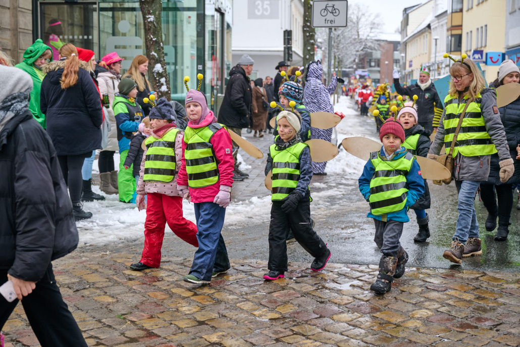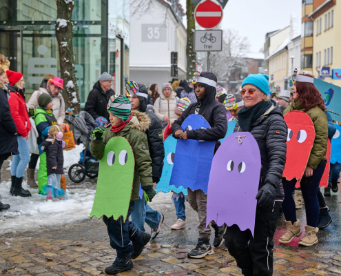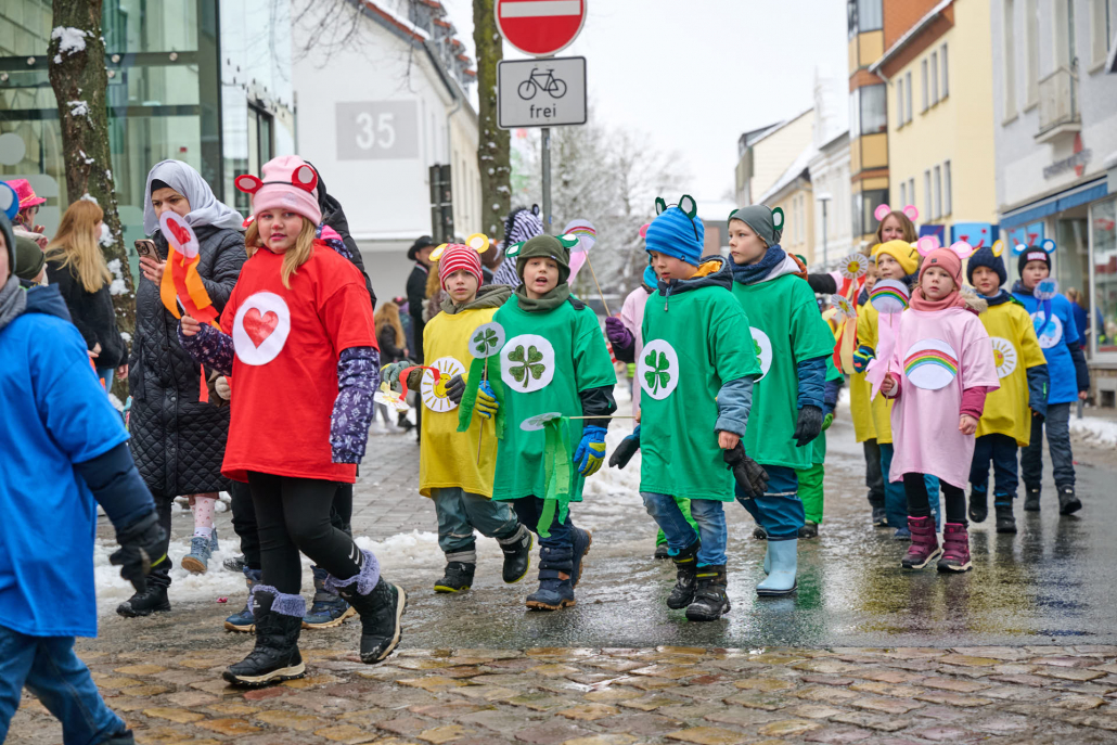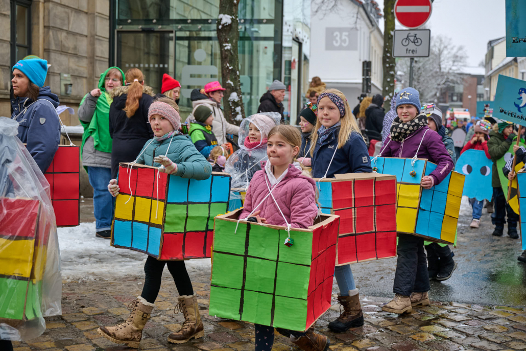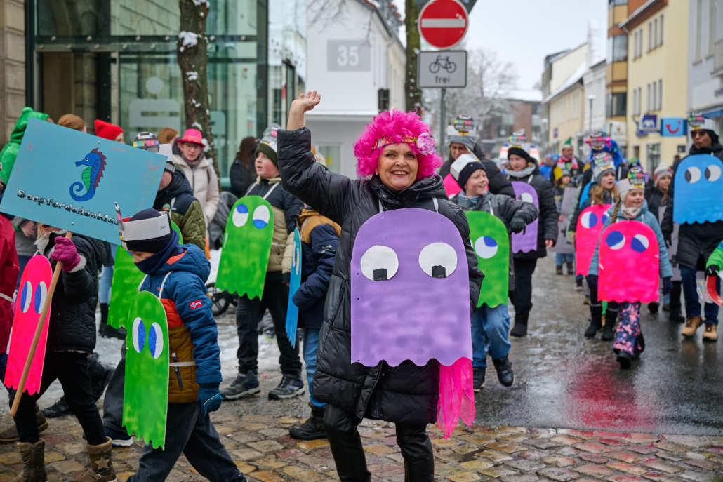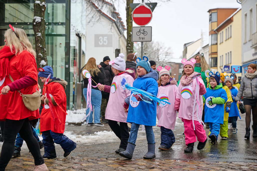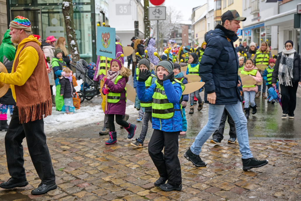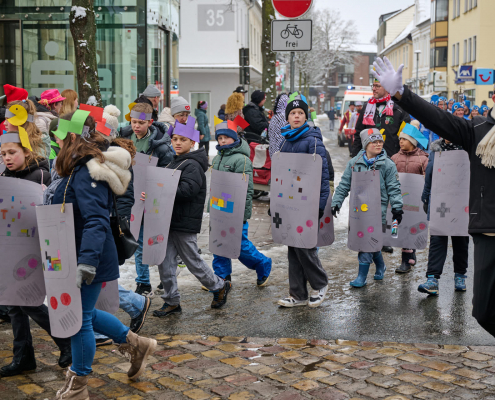 Bunt und laut ziehen die Schüler dann durch die Innenstadt, vor das Rathaus, wo sie vom Bürgermeister empfangen werden.
