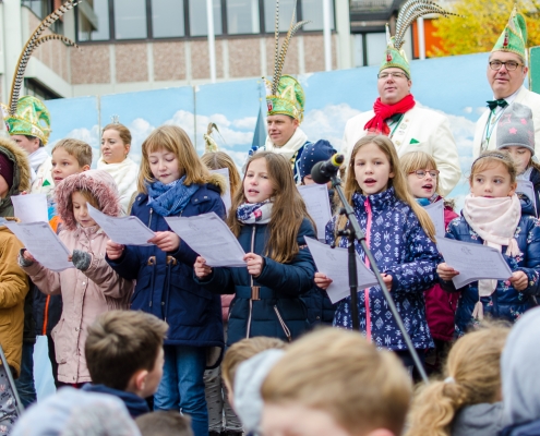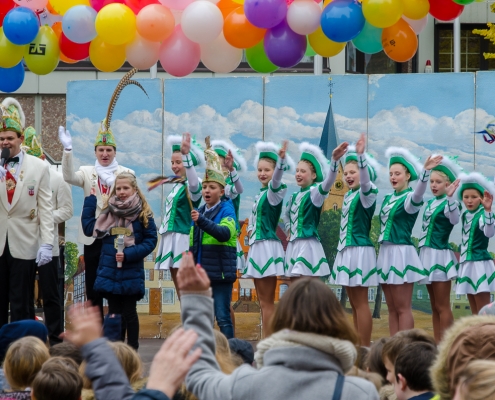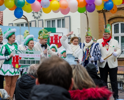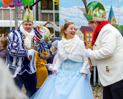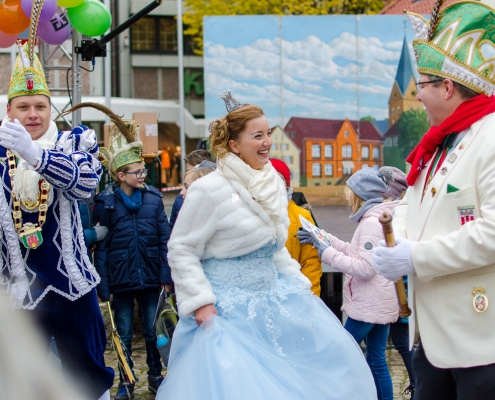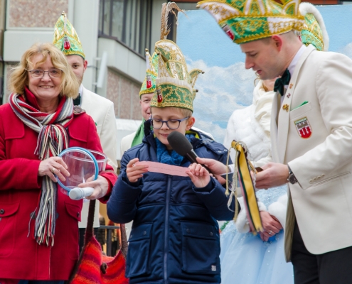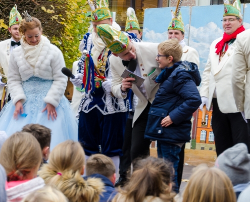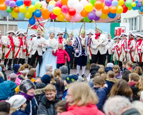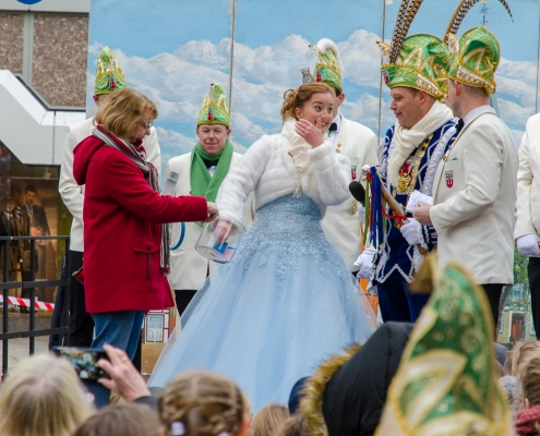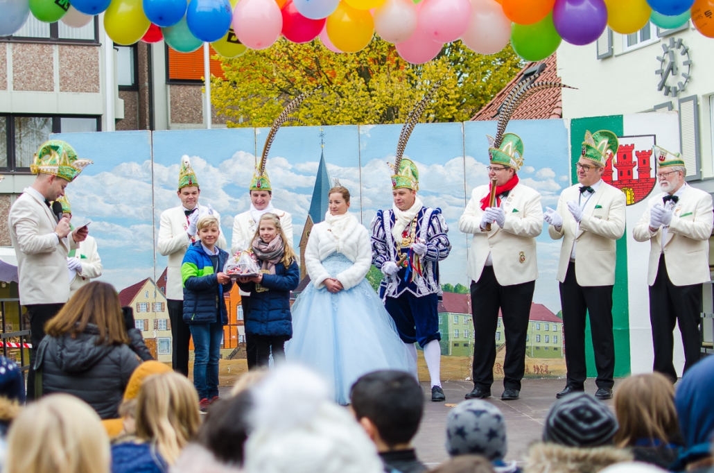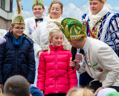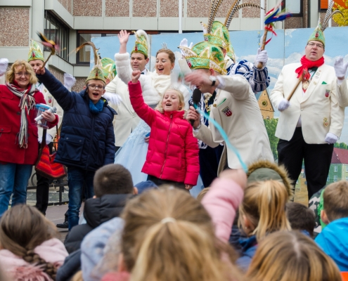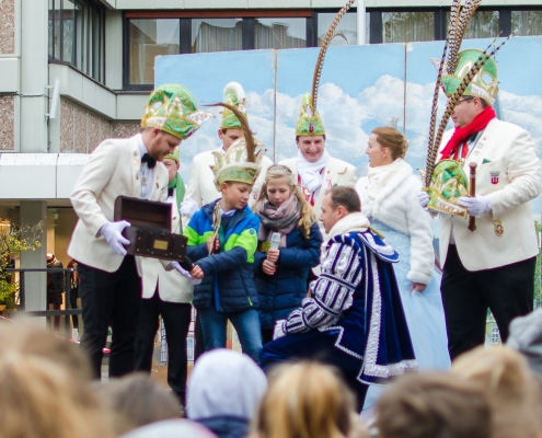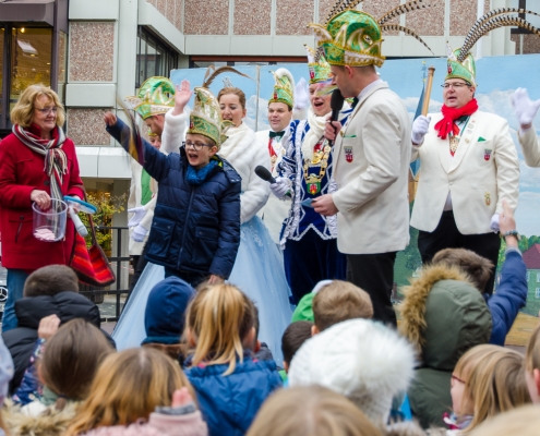 Vizepräsident Markus Brexel hatte ein prima Programm zusammengestellt, das natürlich auch unser Prinzenpaar, Katrin und Christian Hennig, sichtlich genoss. Ganz besonders freuten sich aber die Kinder der Grundschule auf das tolle Programm, denn hier würde heute Ihr neues Kinderprinzenpaar, das auf Paul Pettig und Lilli Wiedemeier folgen sollte, gekürt. Schulleiterin Irmgard Hake hatte gleich elf Kinder in ihrem Lostopf. Prinzessin Katrin zog als Kinderprinzen … Arne Lödige aus der 4a! Der frischgekürte Kinderprinz durfte seine Prinzessin dann selbst ziehen und es ist … Leni Horstmann auch aus der 4a! Das überglückliche Kinderprinzenpaar feierte und schunkelte gemeinsam mit den fröhlichen Närrinnen und Narren noch lange die Kälte vom Marktplatz! Hurra, es ist wieder Karneval!